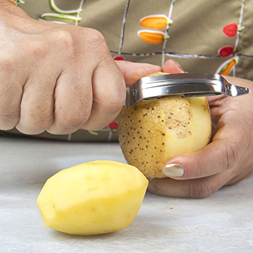 REDUCE WASTE AND PREP TIME with our ultra-sharp peeler. The micro-thin cutting edge smoothly removes peels from potatoes, apples and other foods, cutting grocery costs and leaving more food to enjoy.