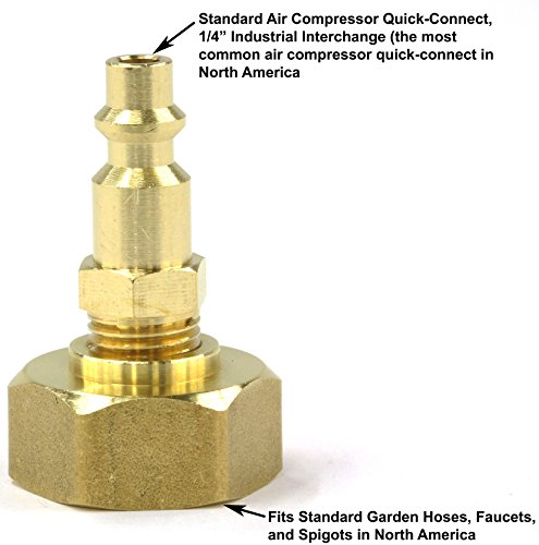 Its 1/4" Industrial Interchange Quick Connect plug is the most common connection for air compressors in North America. Its 3/4" GHT Garden Hose Thread is the most common garden hose fitting in North America.