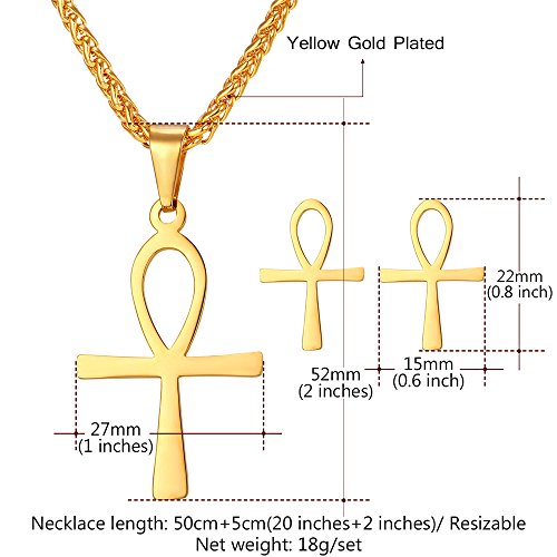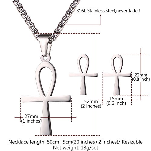 -. Feature : Ankh Jewelry: necklace+ earrings / Metals: stainless steel. / Dimension: pendant 2 x 1 inches, chain 22 inches, earrings:0.8 inch. / Weight : necklace 16 grams, earrings 2 grams. Nickel free. / Gift wrapped: come with U7 design gift box. 90-Day money back or exchage warranty.