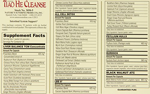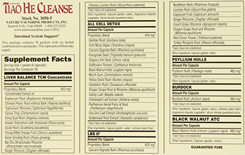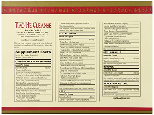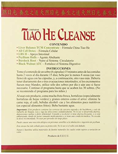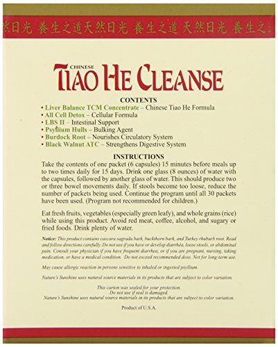 -. Binding : Health and Beauty -. Brand : Nature's Sunshine -. EAN : 0099904030503 -. Feature : Whole body cleanse / Easy to take with you packets. NO need to carry 6 bottles of different herbs!! / Composed of traditional Chinese herbs designed to help your body detox itself / Strengthens colon tissue. Supports proper digestion and intestinal function. -. IsAdultProduct : 0 -. Label : Nature's Sunshine -. LegalDisclaimer : These statements have not been evaluated by The Food and Drug Administration. This product is not intended to diagnose, treat, cure or prevent any disease. -. Manufacturer : Nature's Sunshine -. Model : 3050-5 -. MPN : 3050-5 -. PackageQuantity : 1 -. PartNumber : 3050-5 -. ProductGroup : Health and Beauty -. ProductTypeName : HEALTH_PERSONAL_CARE -. Publisher : Nature's Sunshine -. Studio : Nature's Sunshine -. Title : Nature's Sunshine Tiao He Cleanse (15 Day) (30 Packets) -. UPC : 099904030503