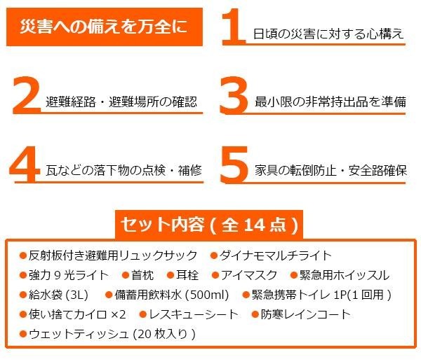 | セット内容 | 反射板付き避難用リュックサック、ダイナモマルチライト、強力9光ライト、首枕、耳栓、アイマスク、緊急用ホイッスル、給水袋(3L)、備蓄用飲料水(500ml)、緊急携帯トイレ1P(1回用)、使い捨てカイロ×2、レスキューシート、ウェットティッシュ(20枚入り)、防寒レインコート |