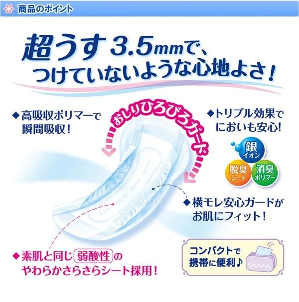 | 仕様 | 目安吸収量:~300cc 弱酸性表面シート採用 トリプル消臭(脱臭シート・銀イオン・消臭ポリマー) 尿ケア用ナプキン 特に多い時も長時間安心・夜用 |
