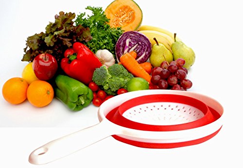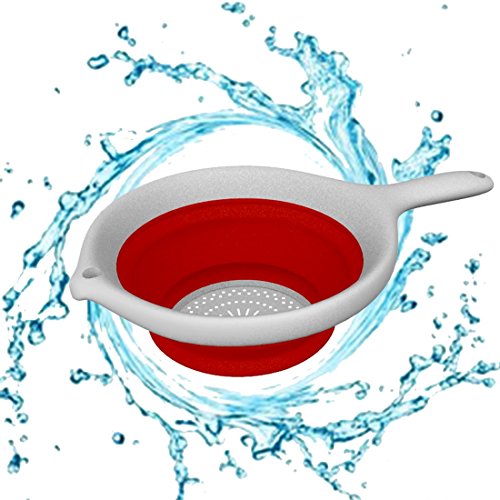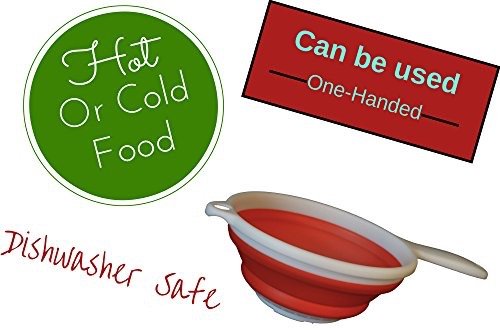 Premium Collapsible Colander, Strainer, Red, Silicone 1" Flat Space Saver, Hot or Cold Food