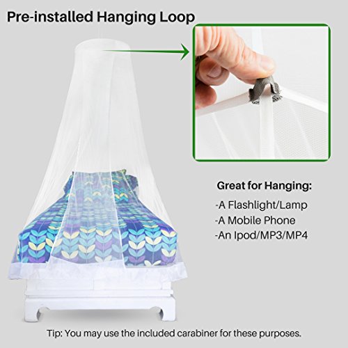 ✔ REINFORCED SEAMS AND SKIRT TESTED FOR MAXIMUM DURABILITY – Handcrafted mosquito netting notably Reinforced On All Areas where tearing may exist, the long skirting makes the bottom weighted which holds the net in place, perfect as Decorative Canopy Curtains, the automatic pop up canopy ring is installed making it portable and multi use for indoor and outdoor PLUS Pre-installed INTERNAL HANGING LOOP sewn inside the net for hanging a flashlight, ipod or mobile phone.