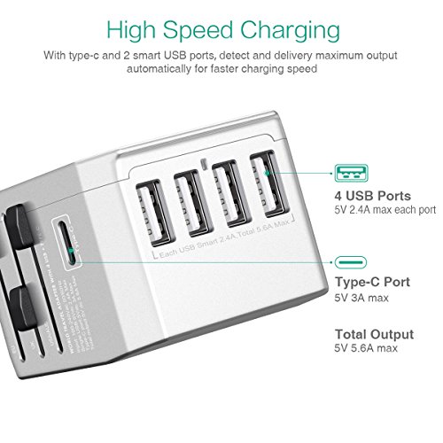 3. SMART USB PORT FOR FAST CHARGING: With wide range input, Max. 5.6A 100-240V AC. Smart single USB port: Max Output 2.4A, 5V DC, USB Type-C port charger: Max Output 3.0A, 5V DC. Total power is up to 28W. Intelligent charging for 5 devices simultaneously.