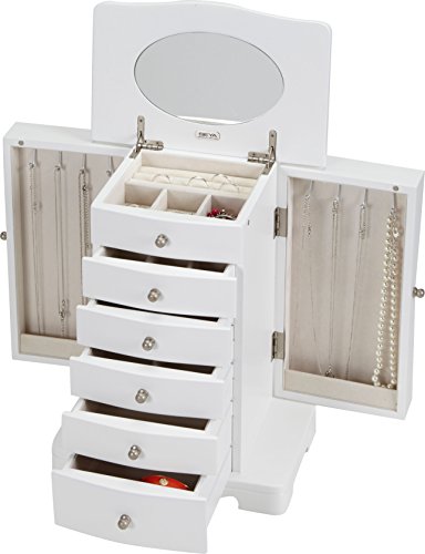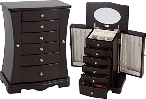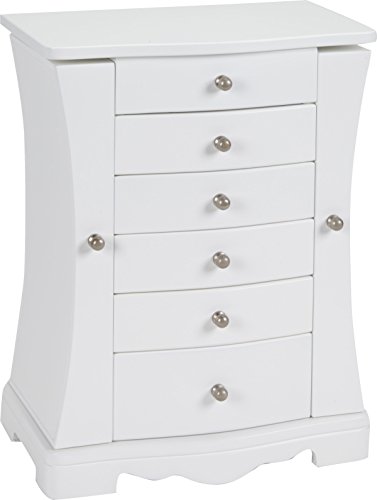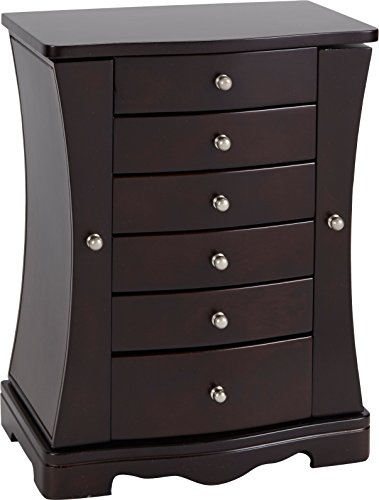 -. Feature : An hourglass profile, nickel drawer pulls, minimal carvings, and a veneer finish / 2 side necklace compartments with 4 necklace hooks on each side. / 5 felt-lined drawers / Inset, beveled glass mirror in top compartment. / Multiple compartments, dividers, and ring rolls for added storage
