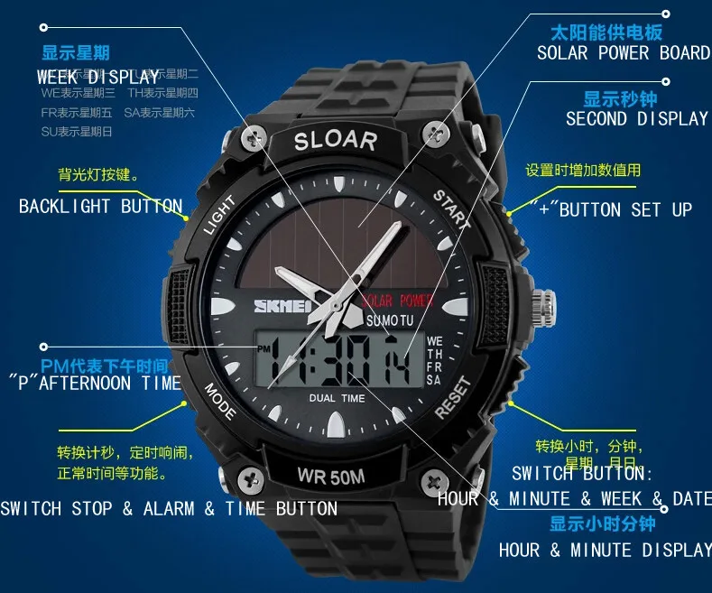 Feature:Back Light,Water Resistant,Multiple Time Zone,Chronograph,Solar,Shock Resistant,Repeater,LED display,Diver