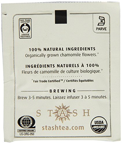 -. Binding : Grocery -. Brand : Stash Tea -. Feature : Brews a beautiful golden cup with a delicate, classic apple-like flavor and fragrance / Certified organic / Makes for the perfect start to the morning or afternoon warmup / Made with 100% natural ingredients / Blended in the USA with natural ingredients from around the world. / This tea brews a beautiful golden cup with a delicate, classic apple-like flavor and fragrance / Kof-K Kosher certified; Caffeine free; Gluten-free; Fair trade certified; Certified organic / Each tea bag individually foil-wrapped / Blended in the USA with natural ingredients from around the world -. Label : Stash Tea -. Manufacturer : Stash Tea -. Model : 79483 -. MPN : 79483 -. NumberOfItems : 1 -. PackageQuantity : 1 -. PartNumber : 79483 -. ProductGroup : Grocery -. ProductTypeName : GROCERY -. PublicationDate : 2013-07-18 -. Publisher : Stash Tea -. ReleaseDate : 2013-07-18 -. Studio : Stash Tea -. Title : Stash Tea Organic Herbal Tea Bags in Foil, Chamomile, 100 Count