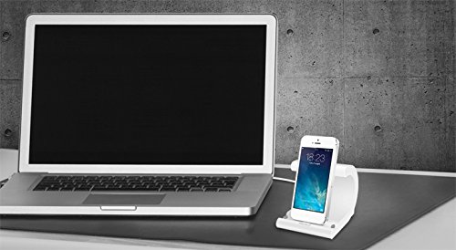 A convenient way to keep your iPhone/iPad charging and synced while you work. Elegantly contoured so your devices fit neatly at home or at the office. Great for your workstation or night stand. Swivel Lightning connector to accommodate iPad / iPhone / iPod Touch with or without protective case. 3′ micro USB to USB cable included for syncing with computer.