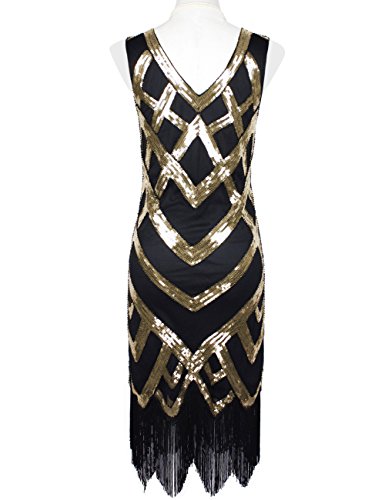 KAYAMIYA Women's 1920S Sequined Beaded Embellishment Gatsby Prom Dress Large Glitter Black Gold