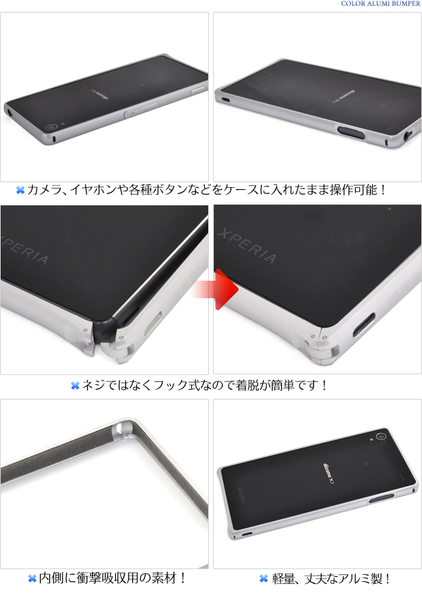 | 軽量&頑丈なXperia Z3(SOL26/SO-01G/401SO)用アルミカラーバンパーケース | | | |