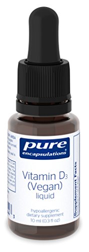 -. Feature : Lichen-derived vegan vitamin D3 to support for bone, breast, prostate, cardiovascular, colon and immune health in a convenient liquid delivery form* / .76 fl oz / 5 drops (0.1 ml) daily, with a meal, or as directed by a health professional. / Pure Encapsulations was founded to formulate and manufacture the highest quality line of hypoallergenic supplements available. All two-piece capsules are hypoallergenic and vegetarian. / Does not contain: added coatings, binders, shellacs, artificial flavors, artificial sweeteners or colors, fragrance, excipients, magnesium stearate, wheat, gluten, nuts, egg, hydrogenated oils or MSG.