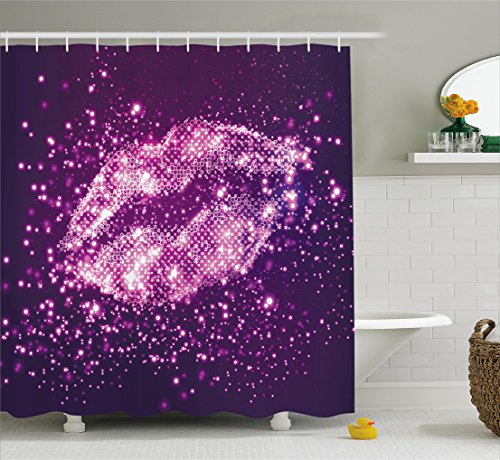 Purple Shower Curtain by Ambesonne, Digital Trendy Woman Lips with Sparkling Vibrant Light Effects Disco Stylized Art Print, Fabric Bathroom Decor Set with Hooks, 84 Inches Extra Long, Purple