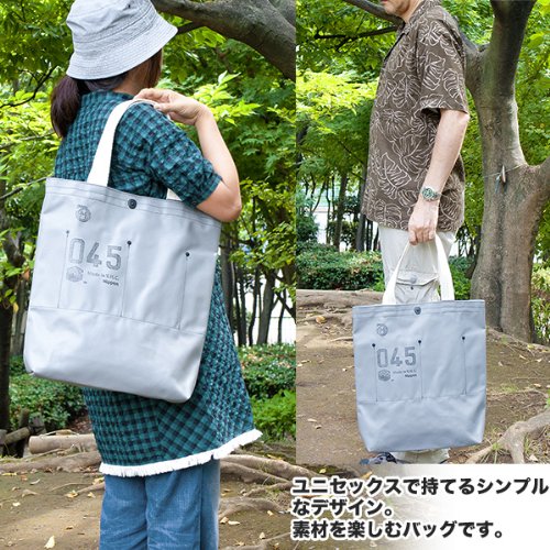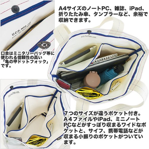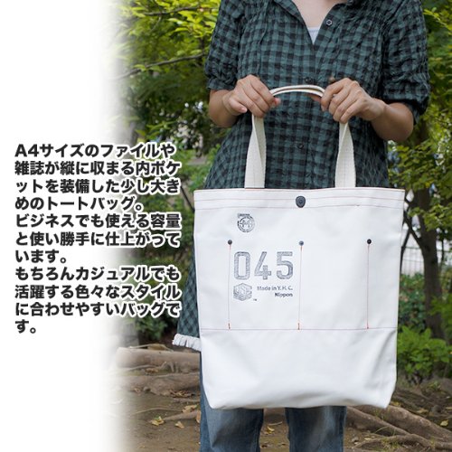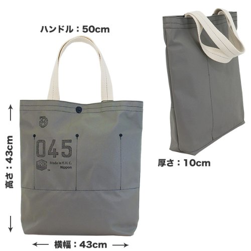-. Feature : 森野艦船帆布4号は海上自衛隊で採用されている「防水、防寒、防炎、防汚」に優れた日本国内で生産されている最も丈夫な帆布です。この帆布を横濱帆布鞄が洗練されたデザインに仕上げたトートバッグです。 / いわゆる帆布素材とは全く異なる、自衛隊仕様に織り上げコーティングされた素材です。帆布に海上自衛隊の過酷な使用環境に耐えるよう、特殊な加工を施したこの素材はレザーの様な質感で光沢があり存在感抜群です! / 「耐候性、耐寒性、耐熱性、防汚性、塩害、耐薬性、防水、防炎、引張強度、抗菌」に優れた海上自衛隊正式採用の帆布を素材としています。A4サイズ対応です。雑誌やファイル、ノートパソコン、iPadが余裕で収納できます。内側には大小7つのポケットがありバッグの中はいつもスッキリ! / A4サイズのノートPC、雑誌やペットボトルなど余裕の収納力です。口金はミリタリーバッグで使われる信頼性の高い亀の甲ドットフォックを採用!船上ではこの生地の汚れは中性洗剤とデッキブラシで落とします。バッグが汚れた場合消しゴムもしくは部分洗いをおすすめします。 / サイズ:43cm、横幅43cm、奥行き10cm、ハンドル:長さ50cm、幅3.8cm、素材:森野艦船帆布4号、M11A1