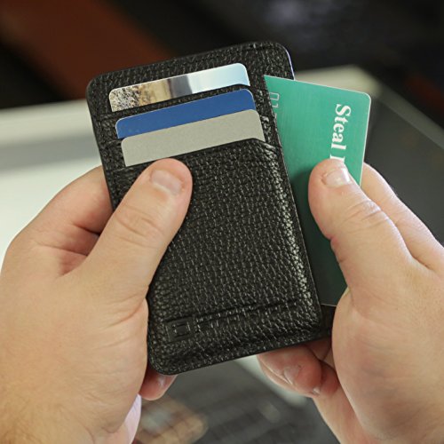-. Feature : INCREDIBLE STORAGE! This is the RFID Wallet that started a revolution in RFID protection. Many of our competitors have tried to imitate this wallet, which is the best form of flattery! This compact secure leather wallet can expand to hold many cards. It has 4 card slots on one side, an ID window on the other, and a pouch in the middle which can hold up to 15 cards plus cash plus receipts. This wallet appeals to both men and women and will fit in your front or back pocket comfortably. / You're less likely to lose your wallet by theft or misplacing it when your wallet stays in your pocket. Think about going to the grocery store and leaving your large clutch on the front seat of the cart or in your handbag, and then turning around and reaching for something on a shelf. With your mini safely in your pocket, there's no need to worry. You can put your essential license, payment card, and cash in one mini, and keep a second one in your glove box loaded with auxiliary cards. / GENUINE LEATHER. This RFID Wallet offers abundant functionality while remaining small and comfortable. Made with the softest leather, this wallet looks and feels great, making you look and feel great too! / EVERY SLOT SHIELDED to protect your Credit Card, Debit Card, Enhanced Driver's License, Transit Card, Hotel Room Key, Passport Card, etc. transmitting at 13.56 Mhz and higher. Designed with top security in mind. As with all ID Stronghold wallets, every slot, ID window, billfold, and compartment is individually shielded, so your information is protected, no matter where you place your RFID cards. This is not a feature found in most RFID wallets. / PERFECT GIFT! Each wallet comes with its own original ID Stronghold GIFT BOX so you can buy one for yourself, and one for a friend. Looking for something different? Just search for ID Stronghold at the top of Amazon to find all of our styles. Product Dimensions: 4.63 x 3.25 x 0.125 inches • Product Weight: 1.31 ounces