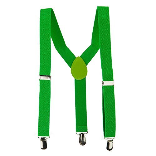 -. Binding : Apparel -. Brand : Buy4 -. Department : boys -. Feature : Made of polyester. / One size fits most children with silver buckle clips. / Youth/Unisex. / Dual belt measures 25 inches long and 1 inch wide (clip to clip). / Hand wash only. -. ProductGroup : Apparel -. ProductTypeName : ACCESSORY -. Title : Kid's Solid Colored Suspenders - Green