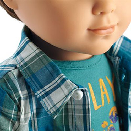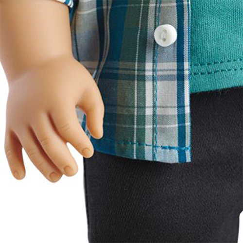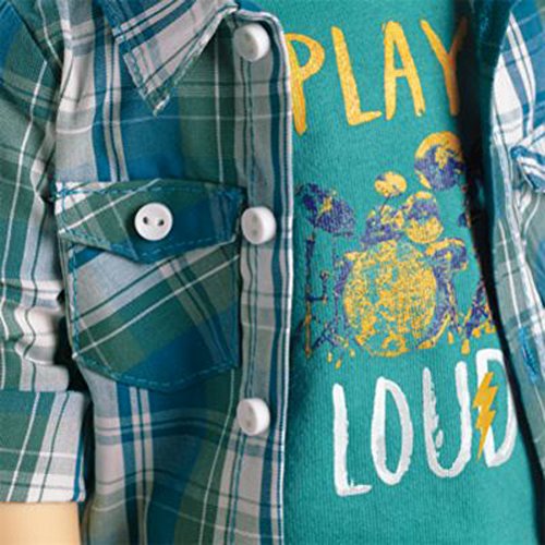 Meet Logan, Tenney's bandmate and drummer! The 18" Logan doll has gray eyes that open and close, and short brown hair. Logan's unique hand positioning helps him hold instruments! He arrives in a plaid button-down shirt, a T-shirt, jeans, underwear, and shoes.Please note:Instruments sold separately.Feature
