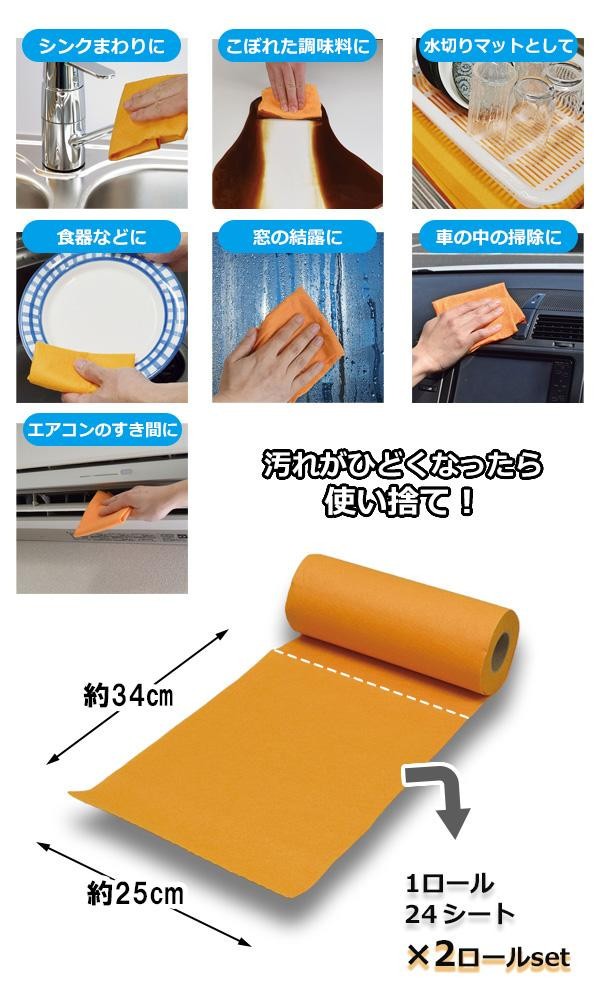 汚れがひどくなったら使い捨て!ロールカットタイプのペーパークロスです。約34×25cmのペーパークロスが24シート(全長約8.1m)分!カットラインが付いているので、ちぎってすぐに使えます。ハサミで切ってもほつれないので、好きな大きさに切って使用可能です。 |