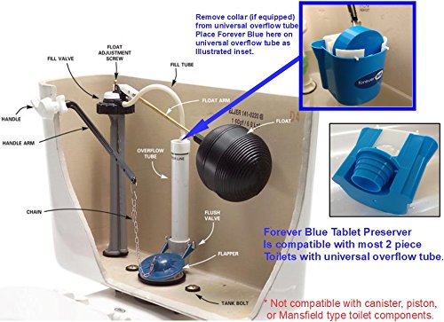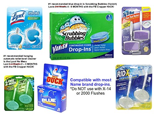 -. Feature : Install & forget! Extends the life of your favorite name-brand toilet drop-in up to 4 - 6 months for a single blue drop-in toilet bowl cleaner, a 500% gain! / Leaves a crisp, glacier blue toilet water refill, never a dark porta-potty blue! / Also helps improve the performance of "Over the Rim" hanging toilet bowl refreshers/cleaners. See photos & details. / Compatible with most 2-piece toilets with universal overflow tube. Simple to install, portable, non-permanent installation. Reusable over & over again. / 100% Satisfaction Guarateed .Patent Pending Int'l. New simple yet super-useful invention! As seen on Kickstarter. Fully Refundable AMAZON return policy.
