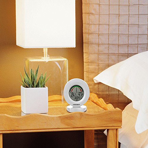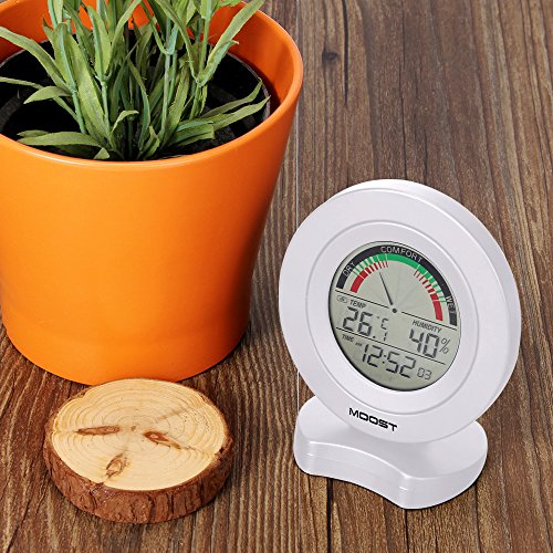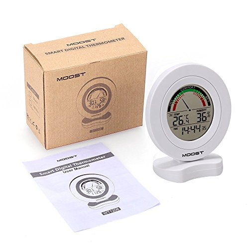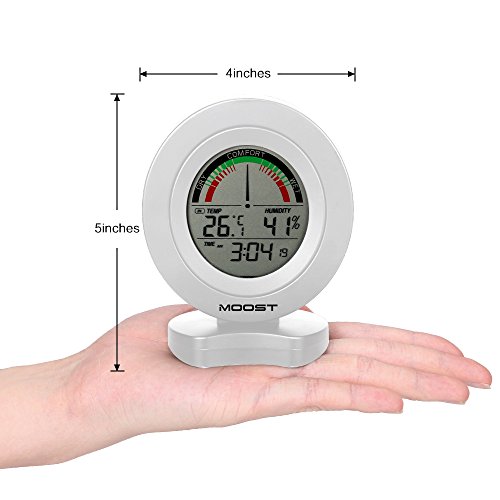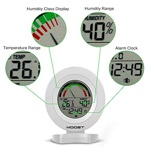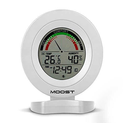 MOOST Temperature Humidity Monitor with Alarms The MOOST Digital Temperature and Humidity Monitor allows you to quickly and easily check comfort conditions with professional-level humidity and temperature sensors in display. The home comfort icon conveys whether humidity levels are too low, too high, or ideal based on Relative Humidity (RH) readings so you can adjust room humidity levels to protect your possessions and improve your feeling of comfort. SPECIFICATIONS: Temperature Range: 0°C to 50°C, Temperature Accuracy: /-1°C Humidity Range:20% to 95%, Humidity Accuracy: /-5% LCD DISPLAY: -Comfor indicatior(dry, comfort, wet) -Indoor temperature -Indoor humidity -Fecords of min/max indoor temperature humidity. -Time Format: 12 or 24 hours -Alarm -Keytone -Low battery indicator PRECATIONS: 1.Pls change batteries timely to ensure the accuracy of receiving data when there is low battery indication. 2.Don't roughly handle the machine. 0