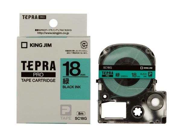 緑色ラベル・黒文字のテープカートリッジです。 |