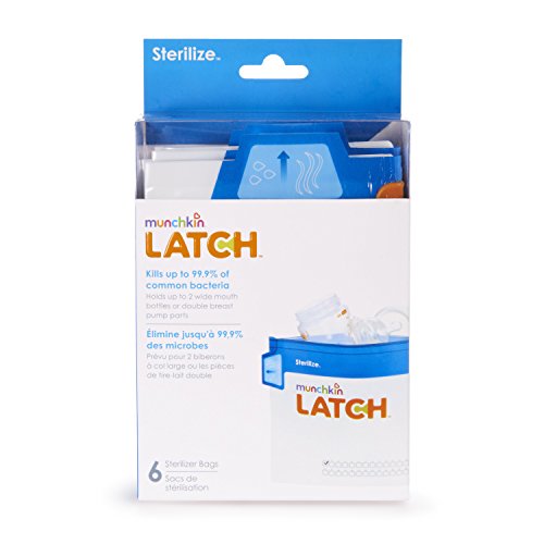 Munchkin's LATCH Sterilize Bags allow you to eliminate 99.9% of bacteria from bottles, nipples, pacifiers, teethers, small toys and breast pump accessories when on-the-go. Just fill the bags with small feeding items and water, pop them in the microwave, and you're full steam ahead for a hygienic clean. The set includes six bags and each bag can be used up to 30 times. The bags come with an easy spot to mark after each steam cycle to help you keep track of how many times you have used them. And to keep you safe from burns, each bag contains Cool-Touch grip for easy handling and a tab opening to allow steam to escape. Baby-safe cleaning should always come this naturally and easily.