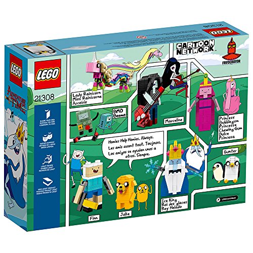 -. Feature : Features eight buildable L.E.G.O brick adventure time characters: Finn, Jake, P.R.Incess bubblegum, lady rainicorn, Mar, BMO, ice King and Gunter / Finn, P.R.Incess bubblegum, Mar and ice King each have movable arms / Accessory elements include mar's axe-bass, bmo's joysticks and ice king's translucent-blue stars and Finn's sword / Bmo stands over 1" (3cm) tall, Jake stands over 1" (5cm) tall, Gunter stands over 1" (4cm) tall / Lady rainicorn measures over 2" (7cm) tall and 7" (20cm) long, Finn stands over 2" (6cm) tall, Mar stands over 3" (8cm) tall and ice King stands over 4" (11cm) tall