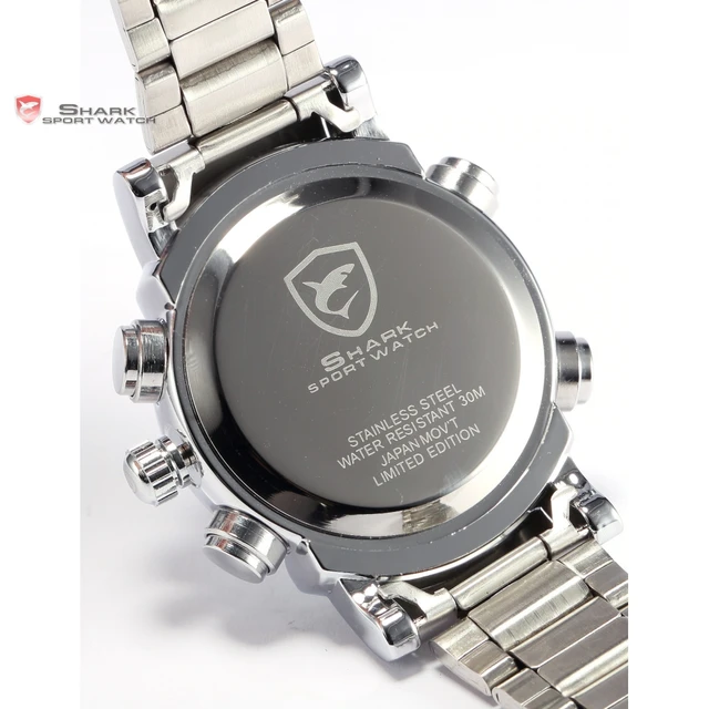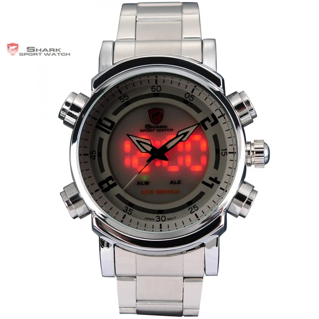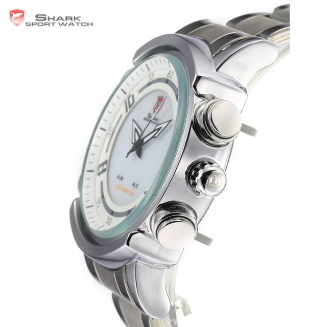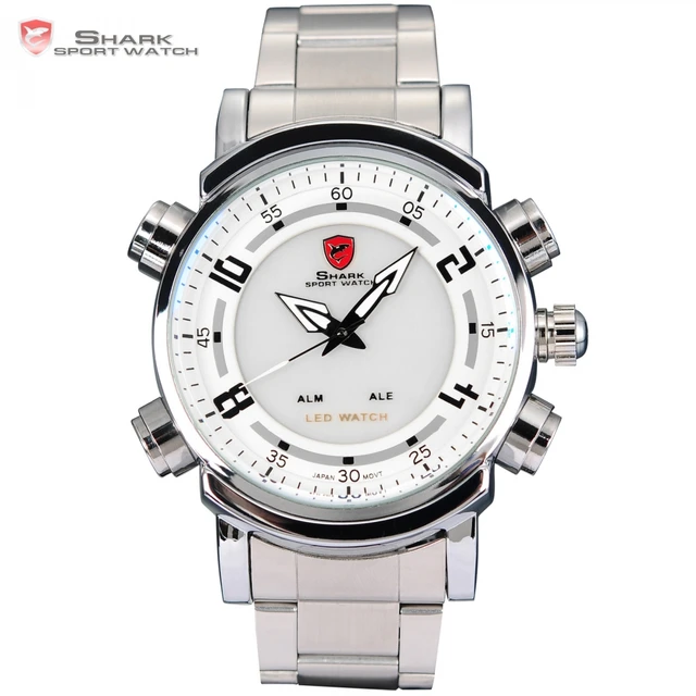 | [해외] Basking 상어 스포츠 시계 디지털 레드 LED 듀얼 타임 날짜 알람 스테인레스 스틸 밴드 화이트 석영 군사 남성 손목/SH062 |