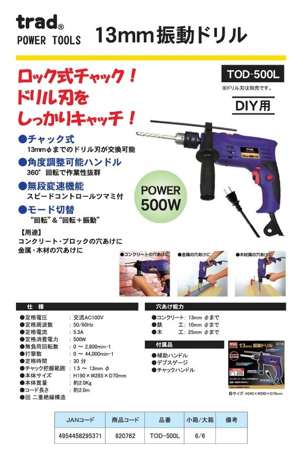 【商品名】(業務用3個セット) TRAD 振動ドリル(電動ドリル) 本体のみ 【500W】 ロック式チャック キー付き TOD-500L ブルー(青) 〔DIY用品/日曜大工〕
