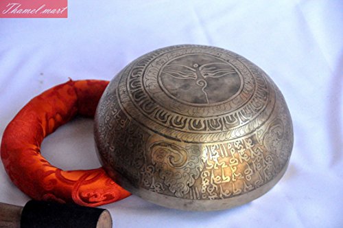 Studio : thamelmart Publisher : thamelmart Product Description This singing bowl is a special bowl, which is made of seven metals, i.e. gold, silver, copper, iron, tin, lead, and zinc. All the metal used has a specific purpose and represent the sun and the moon and other planets. This bowl can be used for meditation, music, and chakra cleansing. A leather striker is included with this singing bowl and this bowl was hand-hammered in Nepal. This bowl is truly hand made in a traditional way at singing-bowl house . Due to handmade bowl,the surface have several marked of hammered on it.The bowl have long lasting tune which create totally peaceful environment around you . who are looking for real handmade bowl from Himalaya will not be disappointing by this bowl. MEASURMENT This is handcrafted bowl therefore please note that each one might have slight variations in measurement. Diameter: 8 inch Height : 4.5 inch Weight : 1600 gram(only bowl) (1931grams with striker and cushion) 0