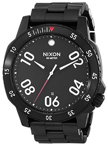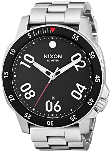 Nixon Ranger watch. Some of us are born to wander; The Ranger is designed with this in mind. Its rugged construction and rotating bezel are inspired by military field instruments to keep you on time no matter how far you roam. And its solid stainless steel band makes an easy transition from off-the-trail to on-the-town. Imported.3 hand quartz movement with concave dial ring, bold printed numbers, a printed seconds track, custom molded hands, and date window. 44mm, 100 meters/10ATM custom solid stainless steel case. 22mm steel 3 link band with a solid stainless steel double locking clasp with micro adjust.Feature