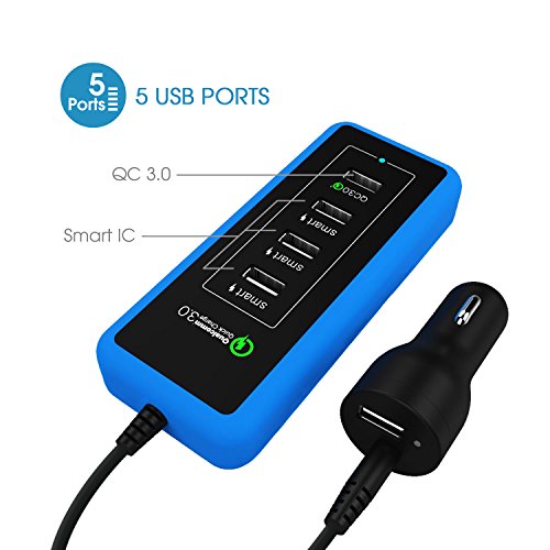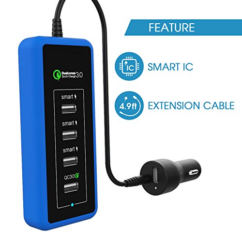 KWORLD 5-Port USB Car Charger, Qualcomm QC 3.0 & Smart IC with 4.9ft extension cable for all smartphones, tablets, GPS & cellular devices, Black(AC-5P3EC-B)