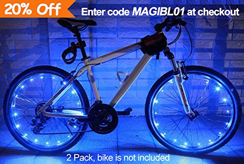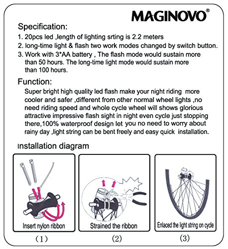 -. Brand : MAGINOVO -. Feature : 20 Bright LED Lights In Waterproof Tubing,Cool Bright LED Bike Accessory / Helps to be Seen And Be Safe During Night Time Bike Riding / 50+ Hours Constant Light, Powered by 3 AA Batteries (not included) / Comes with Waterproof Tubing for Battery Pack and Zip Ties for The Light String / 2-Pack Bundle for 2 Tires -. IsAutographed : 0 -. IsMemorabilia : 0 -. Label : MAGINOVO -. Manufacturer : MAGINOVO -. MPN : WLB001 -. PartNumber : WLB001 -. ProductGroup : Sports -. ProductTypeName : OUTDOOR_RECREATION_PRODUCT -. Publisher : MAGINOVO -. Studio : MAGINOVO -. Title : MAGINOVO Wheel Light LED Bicycle Bike Rim Lights Safety and Fun [2-Pack Bundle for 2 Tires]