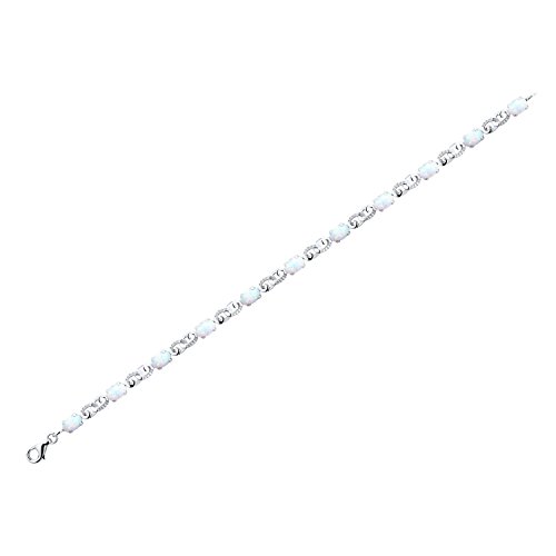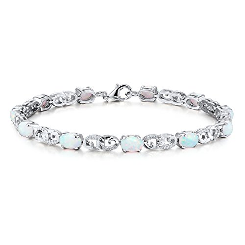 Lovely Lab Created Opal Tennis Bracelet fetures 11 oval shape Lab Created luminous Opals 6x4 MM each. Links have silver bead accents. Bracelet is 7 inches long and Rhodium Plated Sterling Silver. There is a lobster clasp closure. Do not use silver cleaners as they can damage the finish. We recommend cleaning with mild soapy water and buffing gently with a soft cloth.Feature