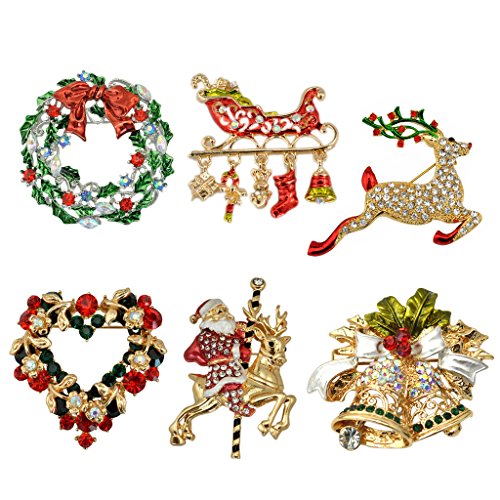 SEWANZ WOMEN'S 6 PCS RHINESTONE CHRISTMAS THEME BROOCH PINS SET, XMAS FESTIVAL DECORATIONS GIFT