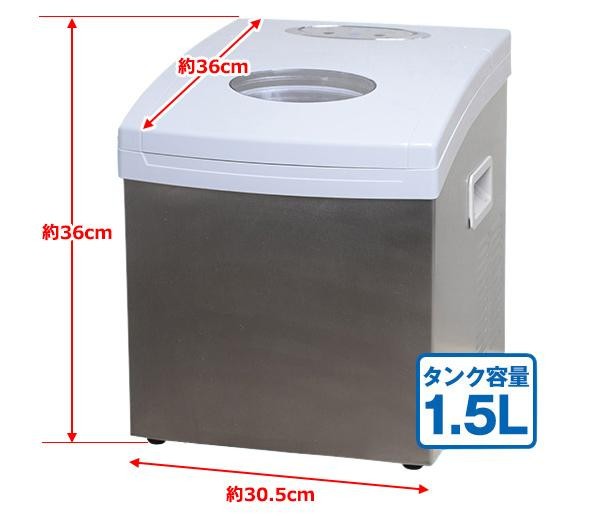 | 仕様 | ●電源:AC100V 50/60Hz ●消費電力:195W ●コード長さ:1.4m ●製氷時間:約25分 ●満氷量:1kg ●水タンク容量:1.5L ●連続使用時間:168時間(1週間) ●騒音:60dB ●冷媒名:R134a ●冷却温度:-25度 ●使用環境温度範囲:10度~35度 |