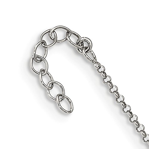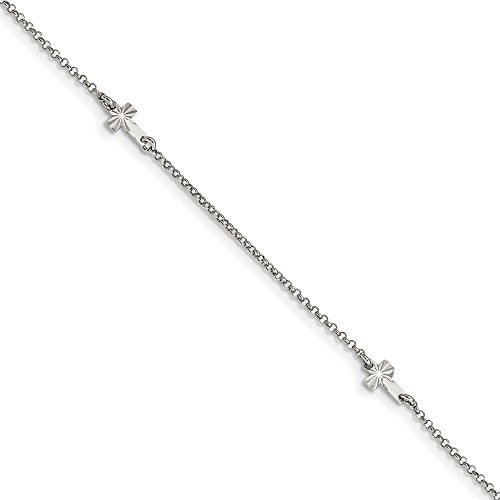 Anklets are a great way to add fun, flash and a feminine touch. This tarnish resistant design made from rhodium plated sterling silver features a 1mm solid link curb chain and diamond-cut, sideways, 6 x 8mm cross charms. It is adjustable in length from 9 to 10 inches and closes with a spring ring clasp. Made in ItalyFeature
