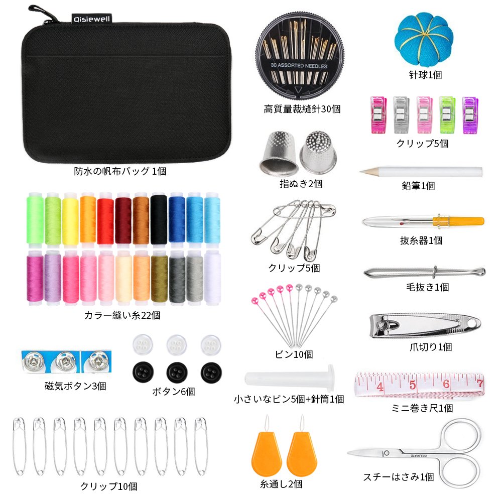- Sewing needle case (30), multicolor thread sewing thread (22), clip (15), pin (10), button (6), small pin (5), clip (5)