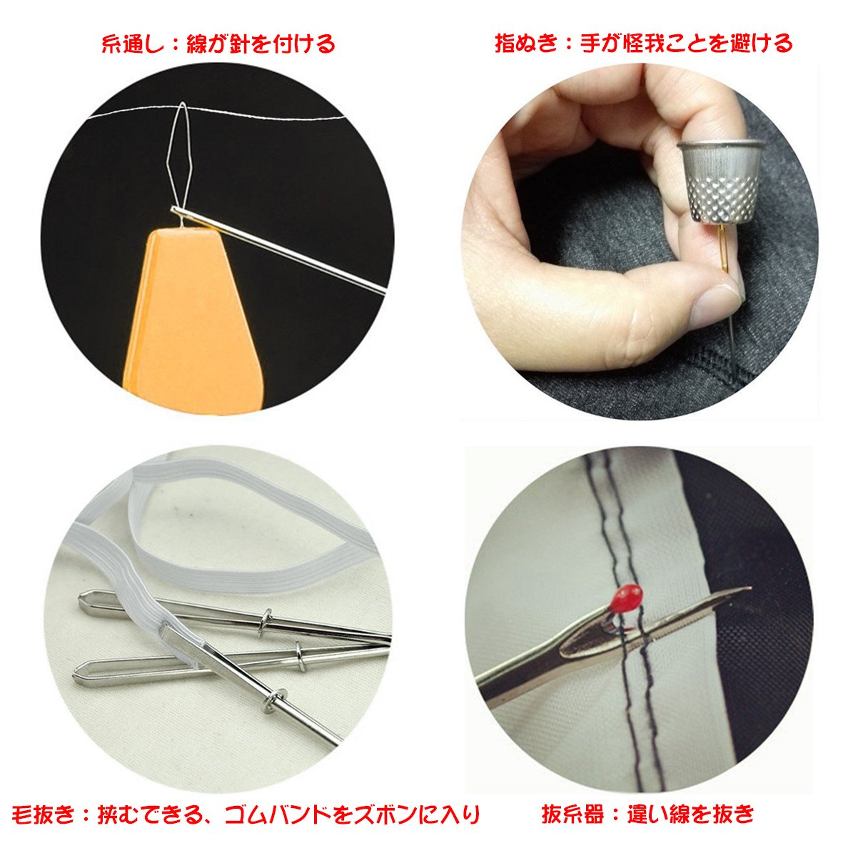 Thimbling (2 pieces), threading (2 pieces), Tape measure (1 piece), sharp nail clipper (1 piece), stainless steel scissors (1 piece), fastening needle (1 piece), pencil (1 piece), sewing needle