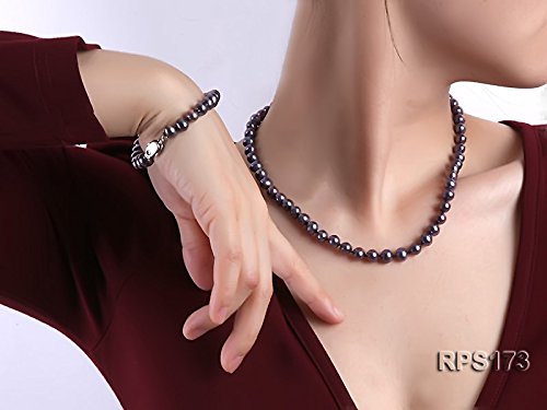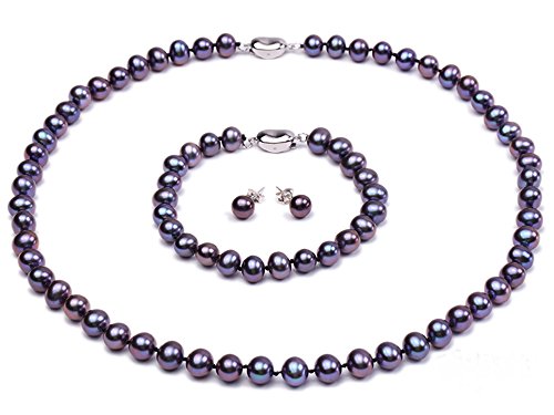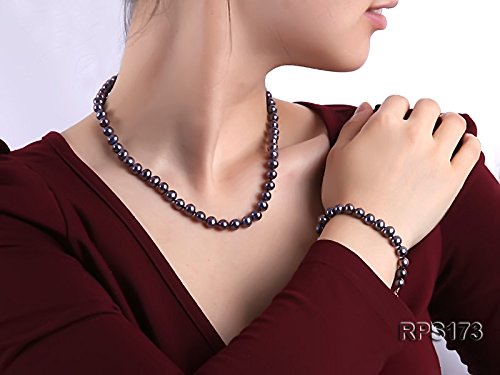 This is a freshwater cultured pearl set made with 7-8mm AAA rating round pearls which contains a necklace, a bracelet and two earrings.