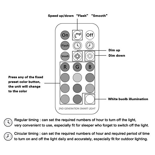 - Memory and Sync color changing: It will remember your last setting. For example, if you turn off your light on green color, It will be green color again when you turn it on. You can use 1 remote control more than 2 bulbs and make them change the color Synchronously. It will make your room filled with color changing atmosphere every corner.
