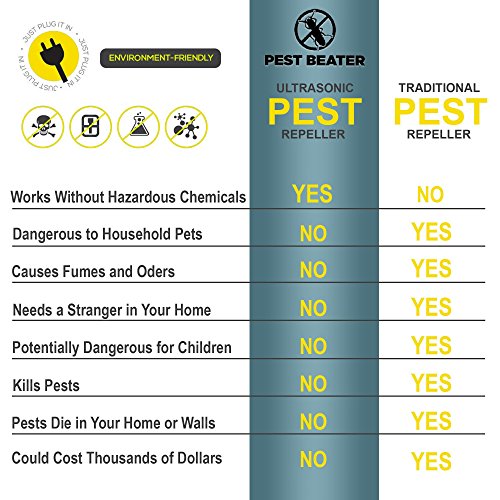 -. Feature : ✔ ELECTRONIC PLUG-IN ULTRASONIC - Uses safe & effective technology to get rid of those nasty pests from your home. Plugs into any electrical wall power outlet for a bug-free home / ✔ BEST PEST CONTROL REPELLER - for Cockroaches, Mosquitoes, Crickets, Rats, Mice, Ants, Spiders, Roaches, Flies, Fleas, Insects, Beetles and other Rodents & Bugs. It will not harm your children or pets, it is completely safe for them / ✔ 100% MONEY-BACK "RISK-FREE" GUARANTEE - This product is backed by our 100% Money-Back "Risk-Free" Guarantee because we want to help you to repel those pests - and we offer a 100% money back guarantee if you do not see results within 3 weeks. Typical results can take 2-3 weeks depending on the amount of infestation / ✔ SAVE THOUSANDS OF DOLLARS while driving away rodents without using any kind of poison, risky traps, or chemicals that smell horrible and can burn your eyes. Use one unit per floor - has a built in night light for indoor use / ✔ LATEST ELECTRONIC TECHNOLOGY - Sends out an inaudible sounds to get rid of pests from your home. In-Audible to the human ear but extremely annoying to any cockroach, mouse, rat or other pest.