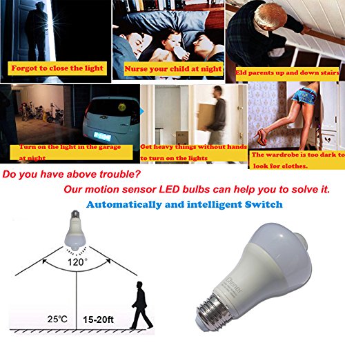 Motion sensor built-in bulb automatically and intelligent Switch: When people or animal are in the range within 15 to 20 feet by motion sensor LED light bulb it will turn on and off automatically.The intelligent LED lamp let you hand-free .And you do not worry about you and your household forgot to close the light.