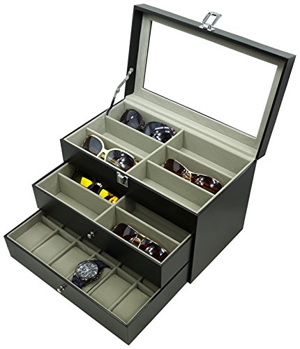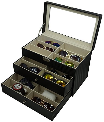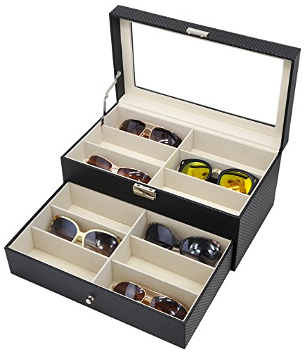 12 individual compartments; extra large space for your large sunglasses; protect your glasses against scratches and dust