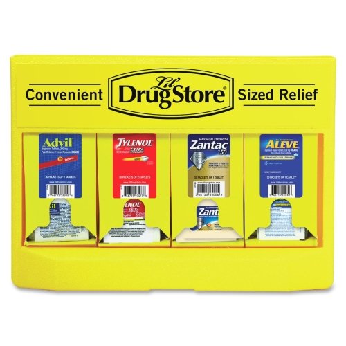 -. Feature : Refillable dispenser made of sturdy plastic and holds single-dose packs of medicine / Includes 30 single-dose packs of Tylenol Caplets, Advil and Aleve; 20 single-dose packs of Zantac 150 / Display can be used as a standalone or is peggable in addition to mounting on a wall