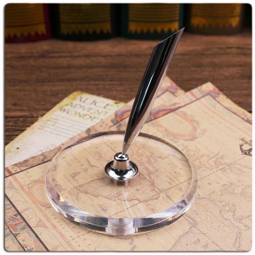 Chris-Wang Desktop Pen Holders Feather Dip Lik Penholder Signature Quill Stand Stationery Gift for Wedding Party, Round Shape Acrylic Crystal Base
