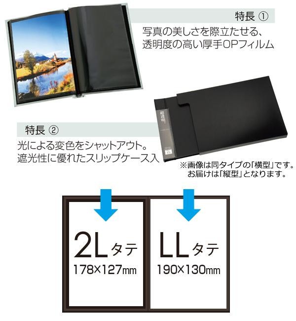 | 仕様 | ■台紙:高透明OP製ポケット×10枚 ■写真収納枚数:20枚 ■中シート:ポリプロピレン製黒フィルム(取り外し不可) ■背角製本 ■スリップケース入 ■背見出しポケット付 |