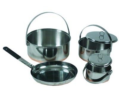 Product DescriptionStainless Steel Camp Cookset includes 1 quart pot with bail handle, 2.5 quart pot with bail handle, 6 quart pot with bail handle, 10 inch frying pan combo lid, Nylon stuff sack0