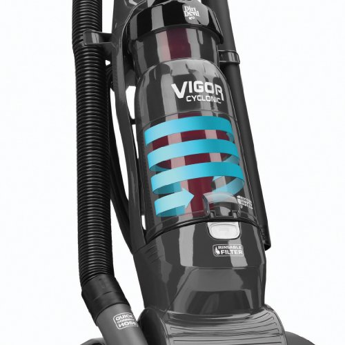 The Dirt Devil® Vigor™ Vacuum is a compact upright that is a simple solution to daily messes. The lightweight design makes it easy to maneuver from room to room. With cyclonic technology as an added level of dirt separation and easy empty dirt cup with bottom empty disposal for mess-free clean up. Multi-level height adjustment makes moving from different floor surfaces easy and 25-Foot power cord allows you to clean a large area without having to re-plug.Feature