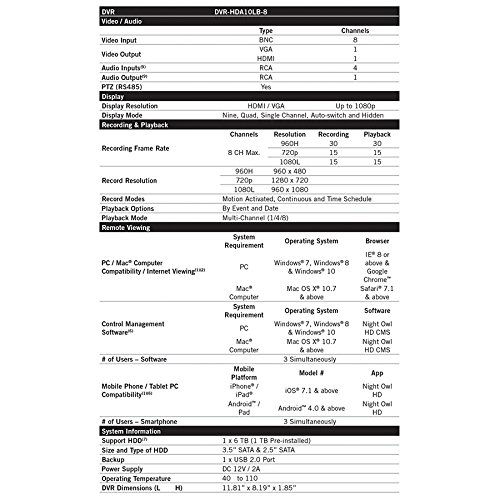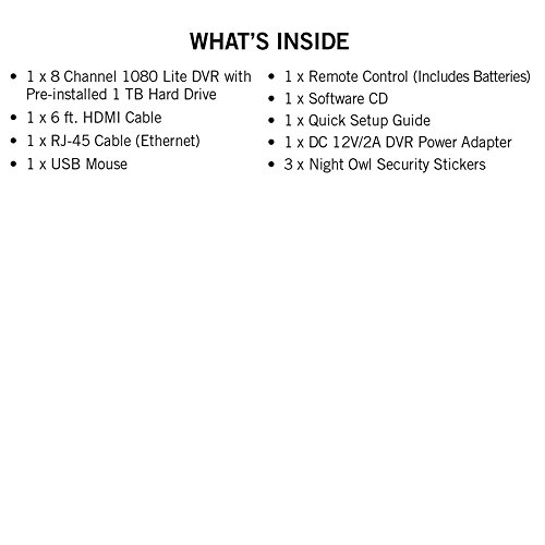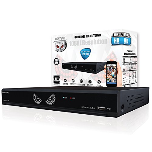 -. Binding : Electronics -. Brand : Night Owl -. Color : Black -. EAN : 0810830023434 -. Feature : Remote Access on your Smart Device - Easy QR Code Network Setup in less than 2 minutes - Owl Scan! / User video is never transmitted to our server nor any third party server, EVER. Once setup is complete, your cameras and smartphone operate as peer-to-peer devices. / Don't want to spend your time monitoring an empty room? No problem! Night Owl's motion detection allows the system to record only when necessary. / This system records up to 1 year of video with its pre-installed 1TB security hard drive. If your needs change, you can always expand the system up to a 6TB internal SATA HDD. / Need help installing the system? Night Owl's professional installation service has you covered. Contact InstallerNet at 1-800-806-5513 to receive a quote and make an appointment. -. Format : CD-ROM -. Label : Night Owl -. Manufacturer : Night Owl -. Model : HDA10L-DVR8-1TB -. MPN : HDA10L-DVR8-1TB -. OperatingSystem : N/A -. PackageQuantity : 1 -. PartNumber : HDA10L-DVR8-1TB -. ProductGroup : Photography -. ProductTypeName : SURVEILANCE_SYSTEMS -. Publisher : Night Owl -. Studio : Night Owl -. Title : Night Owl Security, 8 Channel 1080 Lite HD Analog Video Security System with 1 TB HDD (Black) -. UPC : 810830023434